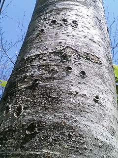 だれのつめあとでしょう。おいしい新芽のコシアブラの木についてます。