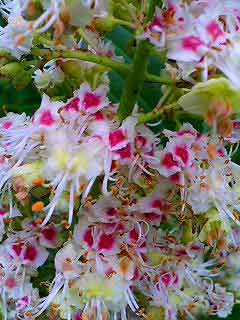 トチノキも葉っぱの上に白いとんがり帽子の花をつけるので、下からでは見づらいですね。