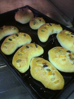 050717_0854~01.jpg クミチャン・パン焼き上がり~♪微妙に形がイビツかな‥? でも自分で作っただけに かわいーよね!?