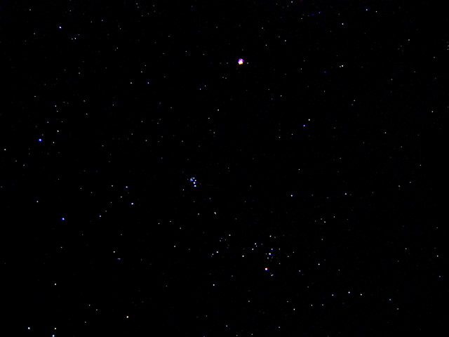 上の明るい星が火星、まん中のつぶつぶしているのがすばる(プレアデス星団)、