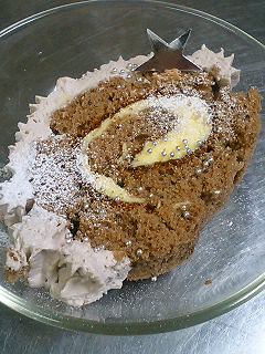 お気に入りのバタークリームを巻いたロールケーキ、ブッシュドノエル風です。