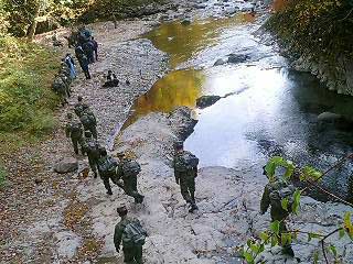 振り向いてみると迷彩色の自衛官さんたちっ、行列しています。